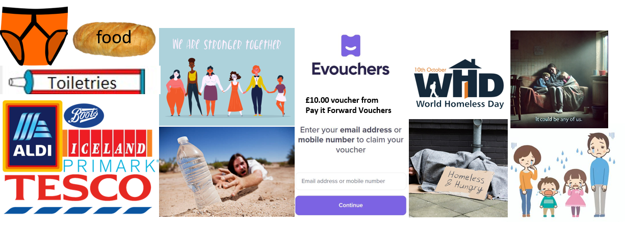 We are a national award winning volunteer-run registered not-for-profit charity that was created to help people in need from all walks of life (homeless or vulnerably housed, single parents, families in crisis, carers, survivors of domestic abuse, prison leavers, cancer patients, etc) either directly or through organisations, to buy essentials from high street shops and supermarkets such as Aldi, Iceland, Primark, etc with a £10 (min) e-voucher.