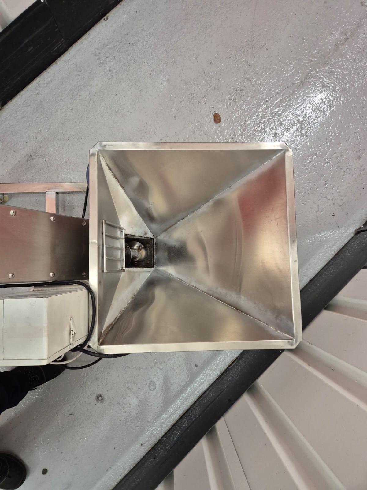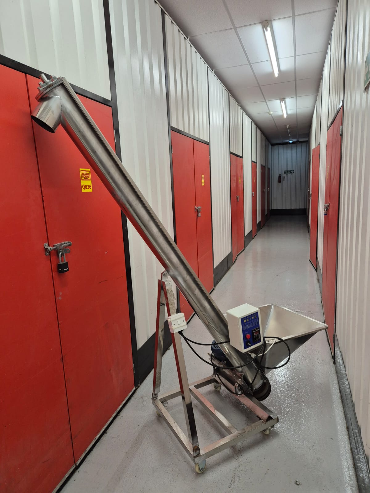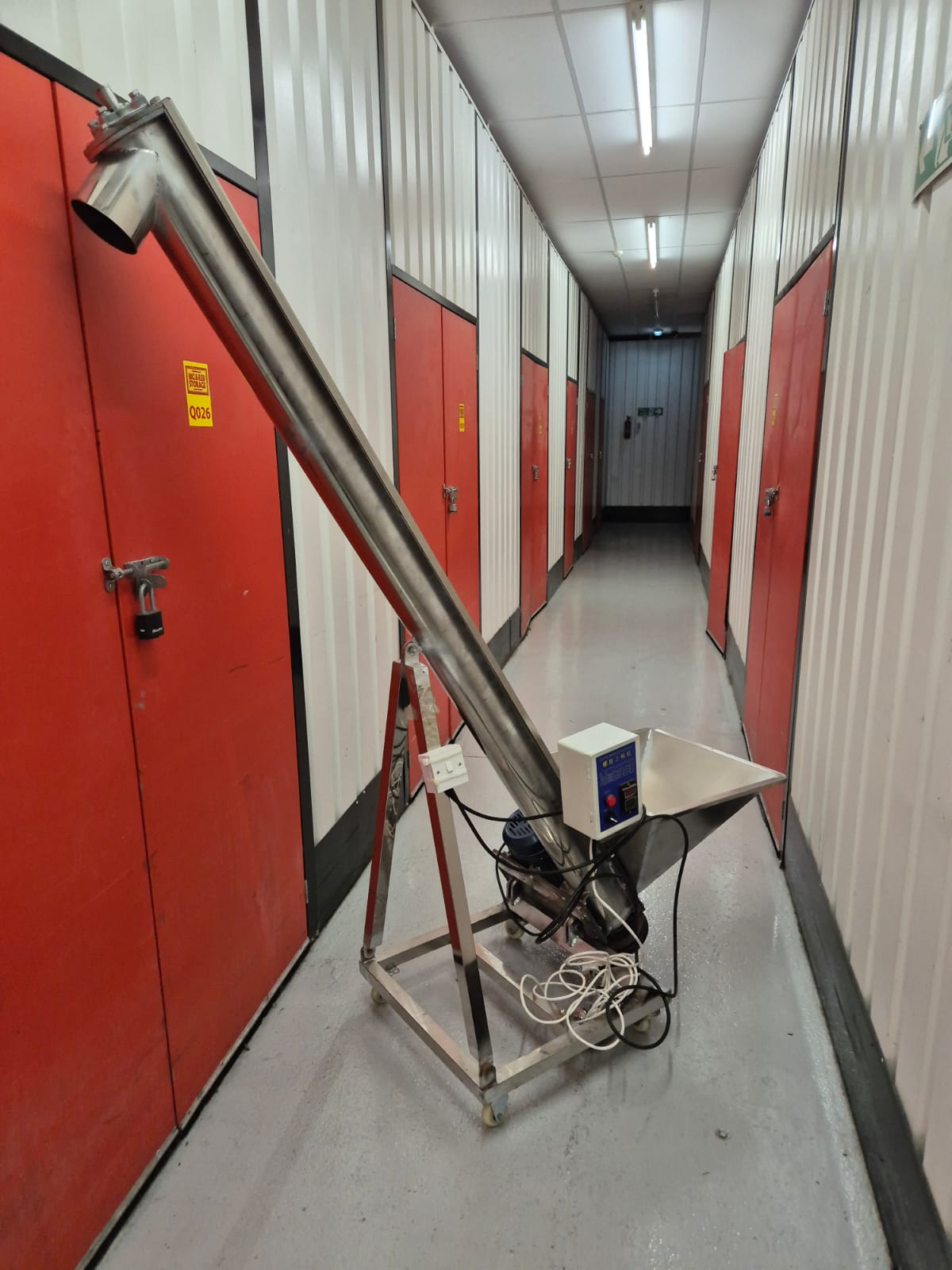 screw conveyor (also known as an auger conveyor). It’s commonly used in industrial and food processing applications to move granular or powdered materials from one place to another using a rotating helical screw blade inside a tube